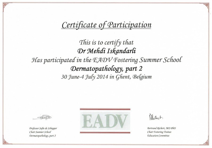 Dermatoloq Mehdi İskəndərli Avropanın ən seçilmiş rezidentlərinin qəbul edildiyi ”Euorderm Excellence” rezident konqresinə daxil olan ilk və yeganə azərbaycanlıdır. Avropa Dermatovenerologiya Akademiyasının (EADV) ”John Stratigos Memorial Scholarship” qrantının qalibidir. Amerika Dermatologiya Akadmeiyasının ”Strauss & Katz Fund Scholarship” qrantını əldə edib. Fransanın Nice şəhərində keçirilən ”Dermatoonkologiyanın Diaqnostikasında Müasir Yanaşma” kursunda təqdim etdiyi kliniki hal ən yaxşı üç mühazirədən birisi seçilmidir və mükafatlanıdırlmışdır. 2017-ci ildə Avstraliyanın Sidney şəhərində yerləşən St. George Hospitalının dermatologiya kafedrasında üç aylıq ixtisasartıma keçmişdir. Türkiyənin, Avropanın və ABŞ-ın dermatovenerologiya cəmiyyətlərinin təqaüdləri ilə təltif edilmişdir.