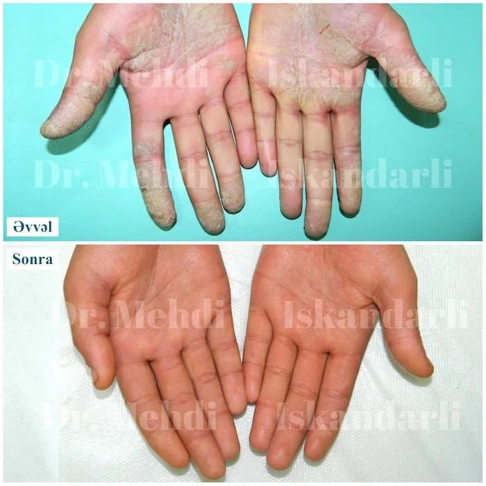 - Psoriaz: qalın, yapışqan qabıqlanma və sərhədli ləkələr.